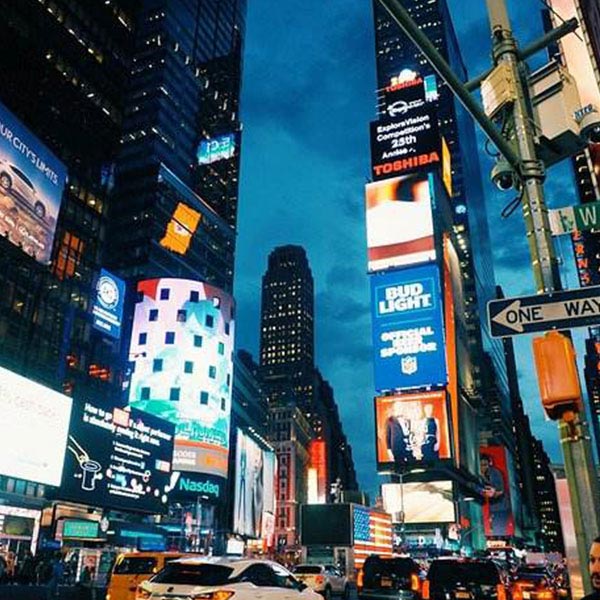 Premium OOH advertising in iconic locations including Times Square (NYC), NASDAQ, and major transport networks across 8 key regions. High-impact brand moments powered by a landmark media matrix for global influence.